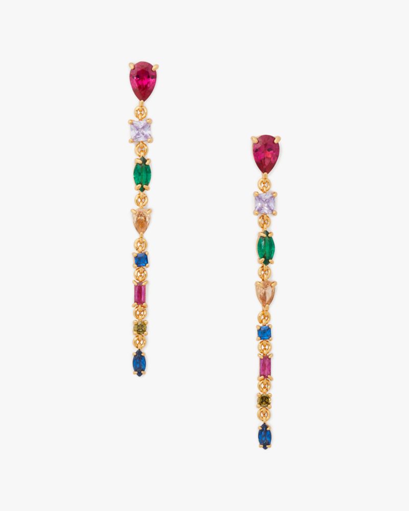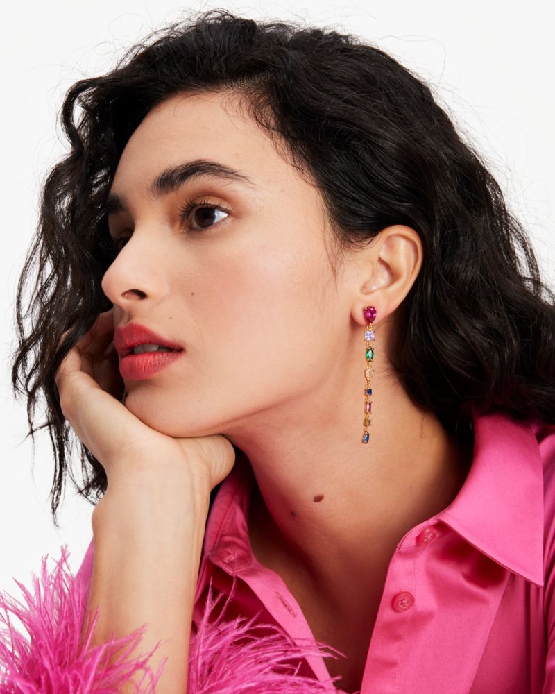 ショウタイム!さあ、周囲の視線を独占する準備をはじめて。色とりどりのクリスタルを連ねた新作リニアピアス。動くたびにキラキラと光を集め、煌めきを放つステートメントピースです。
