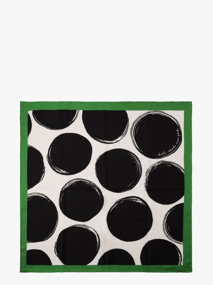 不規則なドットを描いたスクエアスカーフ。肌をなめらかに滑るシルクを用い、エッジをグリーンでトリミングしました。ヘッドアクセサリーや首回り、バッグのハンドルに結んだりとアレンジを楽しんで。