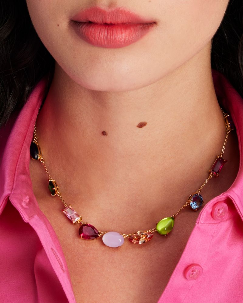 ショウタイム!さあ、周囲の視線を独占する準備をはじめて。ランダムに散りばめた色とりどりのクリスタルが主役の存在感を放つ新作スキャッターネックレス。プレシャスな輝きが顔まわりを魅惑的に照らします。