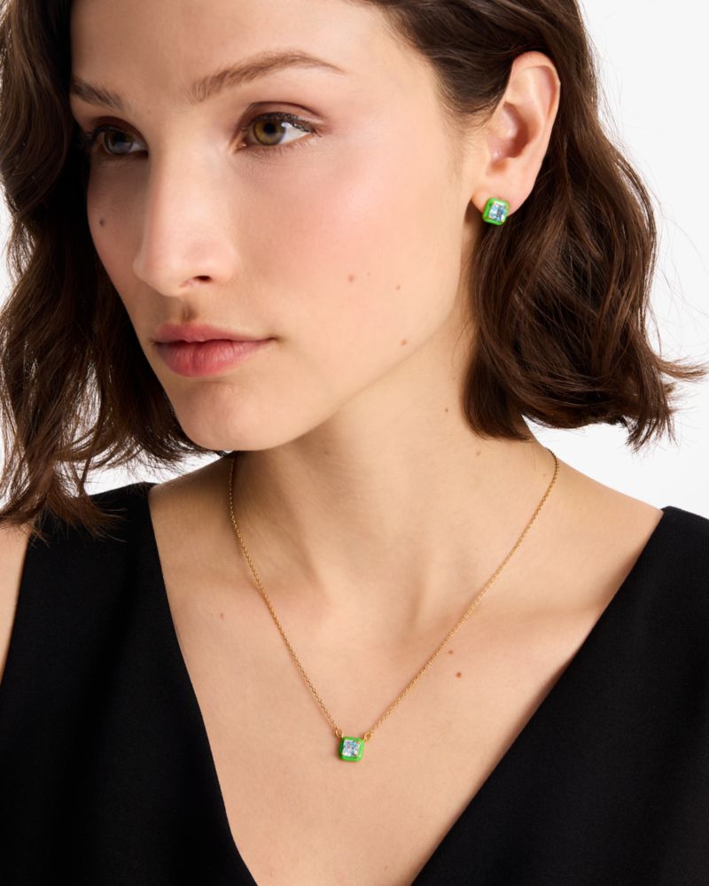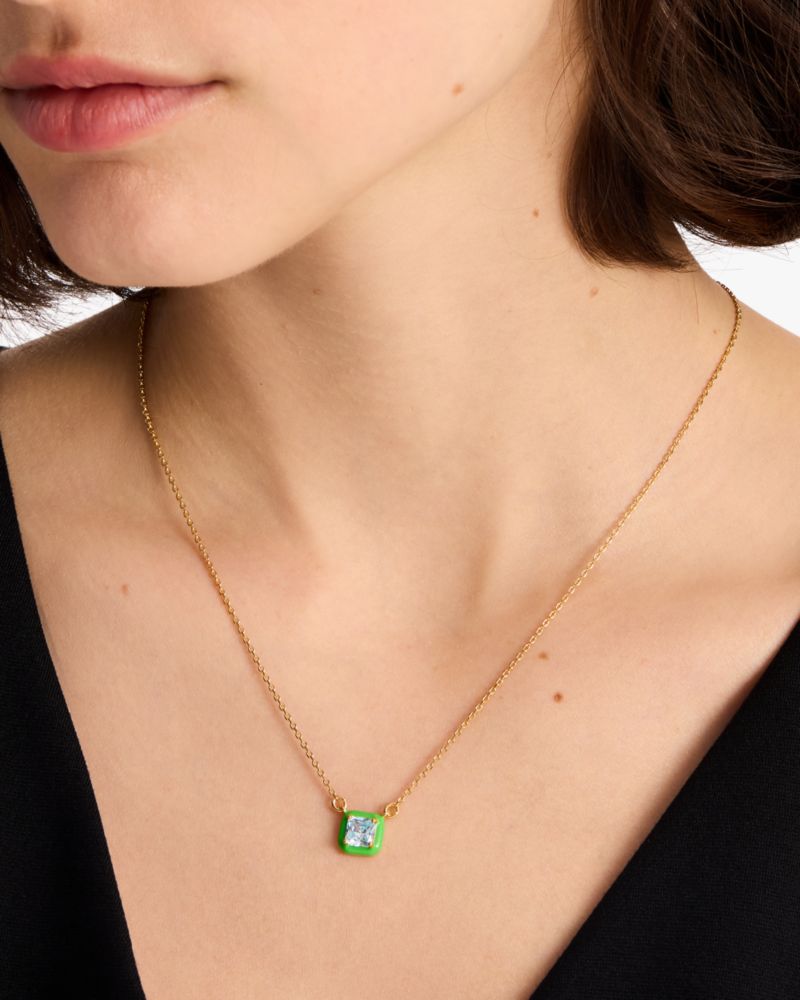いつもの装いにプレイフルな魅力を添えて:カラフルなキュービックジルコニアをエナメルで囲い、夏の明るい陽射しに似合うルックに仕上げたペンダントです。オンオフ問わずに愛用できるサイズも魅力。