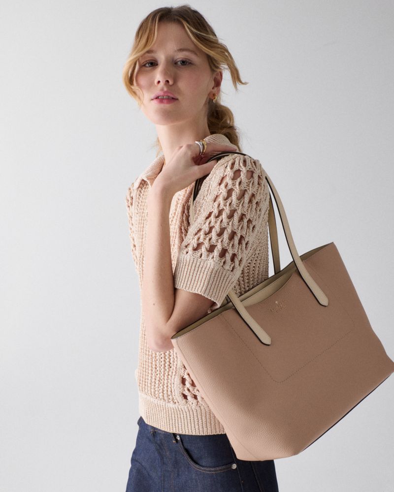 最善を求めるなら、ひとつより、ふたつ。その良き例がこちら:大容量のトートにハート型のミニポーチをハンギングし、さらなる収納オプションと愛らしいアクセントを添えました。ポーチは取り外し可能で、単体でも使用して頂けます。