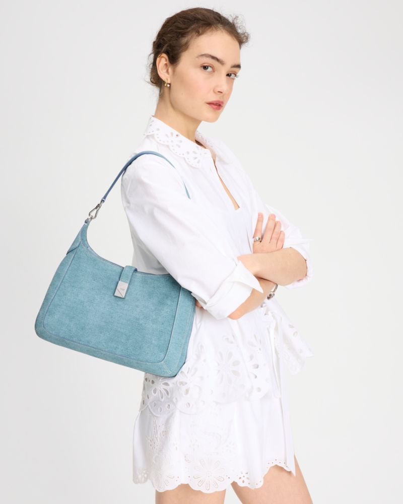 贅沢な仕上げを施すことで流行に左右されないシックなルックを完成し、デイリーから特別なオケージョンまで愛用できる格調高いアイテムを揃えた“デコ コレクション”。このホーボーは、日常使いに活躍するデニムスエードを用い、アールデコ形式から着想を得た新作のKハードウエアでアクセントを効かせています。