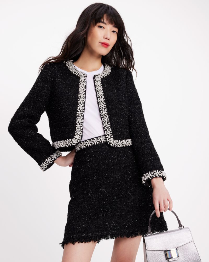 クラシックなツイードジャケットを、きらめくクリスタルと艶めくフェイクパールのアクセントで優雅にアップグレード。スタイルアップにも効果的なやや短めの丈感。華やかなシーンが増えるこれからの季節に活躍するパーフェクトピースです。