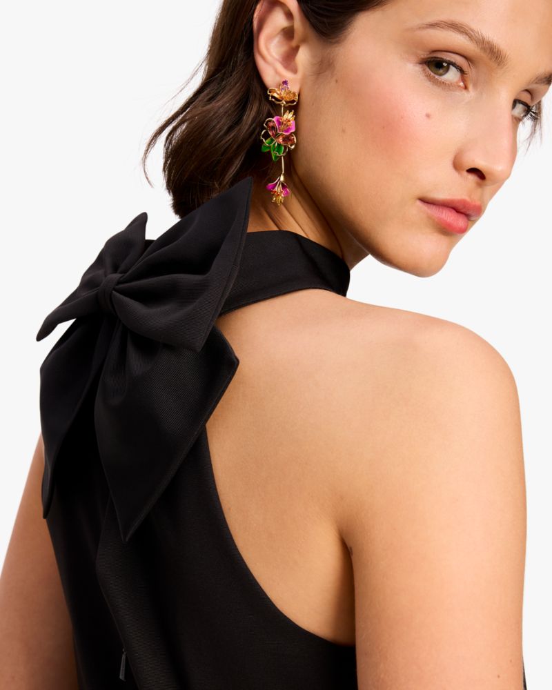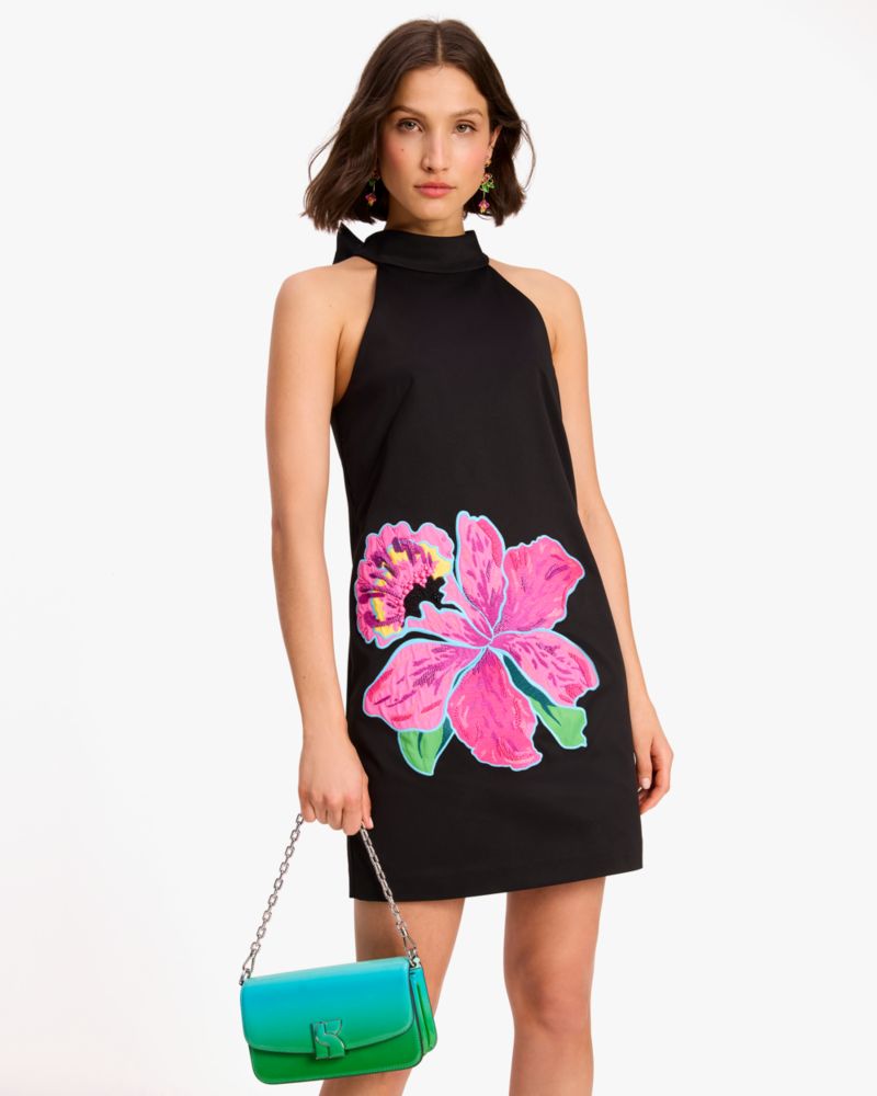 レトロな気分を楽しみつつ、ステートメントなルックも演出できるホルターネックのシフトドレス。軽量のファイユ素材に鮮やかなフローラルのアップリケを咲かせました。夏のディナーやカクテルシーン、そしてバカンスで着こなしたい一枚。