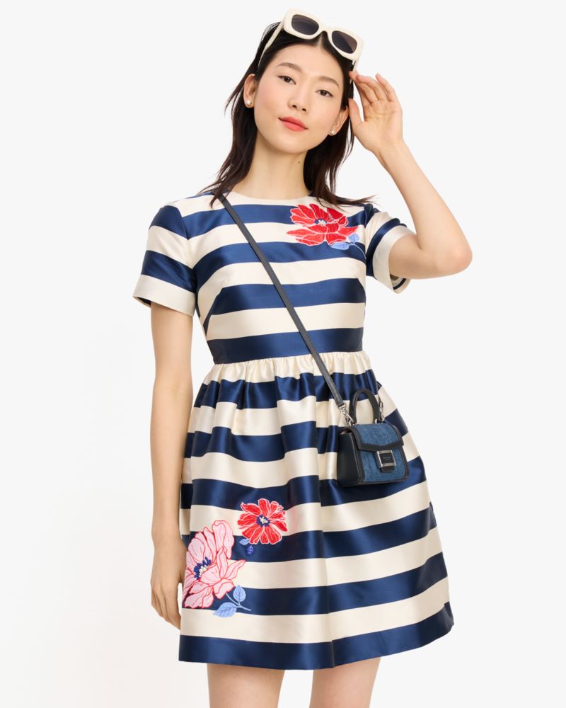 大好きなフローラルとストライプ、その両方を優雅にアレンジしたミニドレス。上質な光沢感とハリのあるマテリアルを生かしたシルエットは、オケージョンシーンにもぴったり。お気に入りのクロスボディとジュエリーを合わせれば、注目のルックが完成。