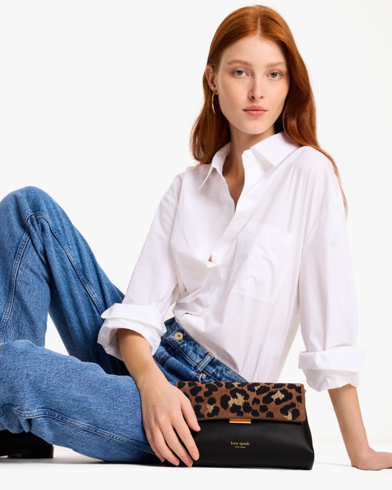 グレースが登場。滑らかなレザーとヒョウ柄スエードを組み合わせたこのクラッチバッグは、構造的なデザインとシックなデザイン、そして幅広い用途で活躍する万能アイテムです。