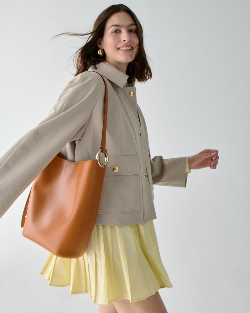 「ヘイロー」コレクションの名の由来、それはリング状のハードウエア:アーカイブからのディテールは、ケイトとアンディ・スペードが創業期に手がけたデザインに遡ります。上質なグレインレザーを用いたこのバケットバッグは、ストラップを調節することでクロスボディからショルダーまで瞬時にスタイルのアレンジが楽しめます。