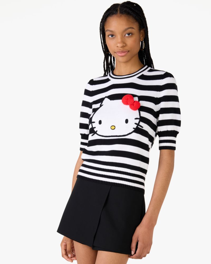 普遍的なかわいらしさで世界中で愛されるハローキティとの限定カプセルコレクションが登場。こちらのセーターには、ボーダー柄にアイコニックなキティの顔をあしらい、ミックス&マッチのクールなルックを演出しています。
