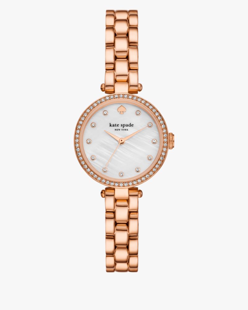 優雅なマザーオブパールのダイアルに煌めくインデックスとトップリングを合わせ、優雅なモダンクラシックを演出したホランドウォッチ。細身のステンレススチールバンドが手首を華奢に見せ、しなやかなフィット感も提供します。