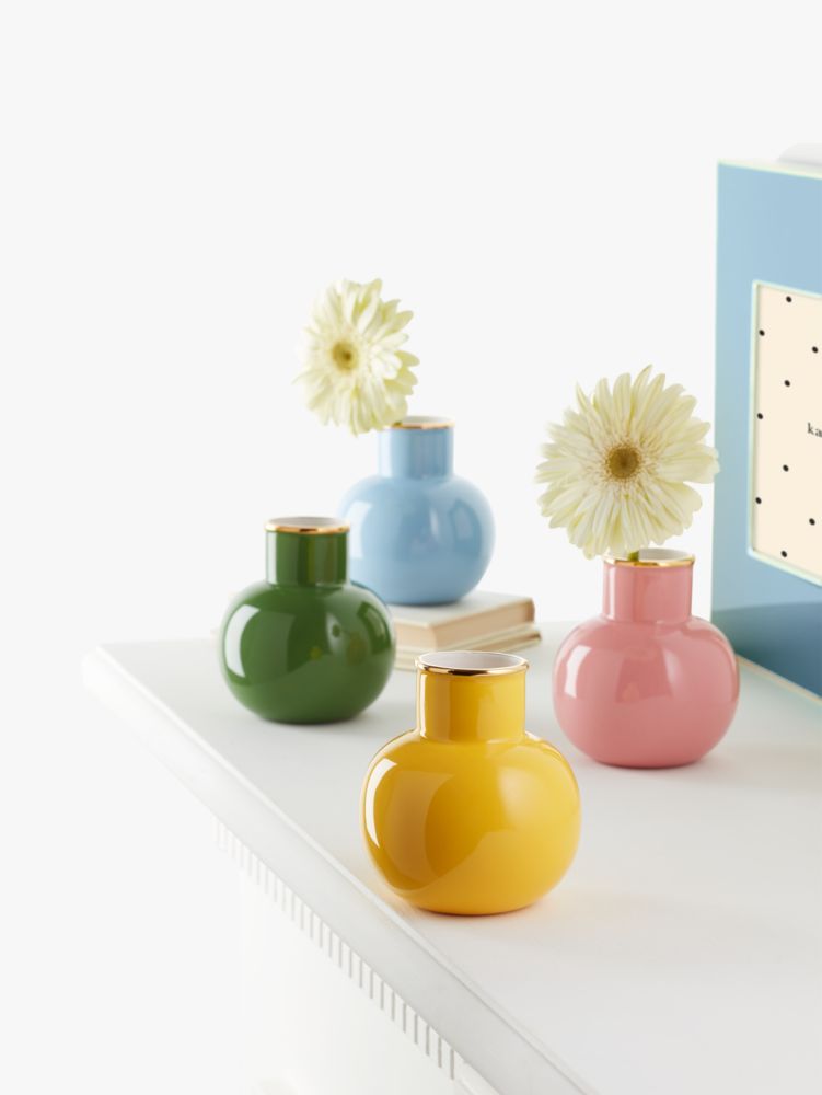 いつもの空間をパッと明るくするなら、愛らしい花束ーそして、その花束を飾るカラフルなベースがあればもっと素敵。艶めくカラーをゴールドトーンのトリミングでエレガントに引き締めたデザインです。デスクやちょっとしたスペースにも置ける小さめのサイズ。