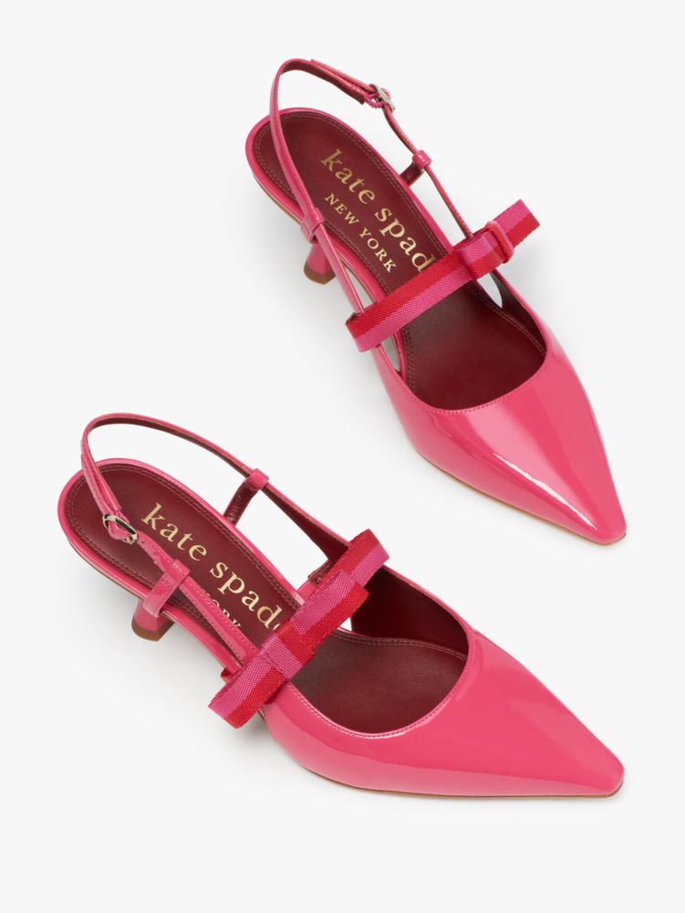 パテントレザー バイカラーのナイロンツイルリボンディテール ポインテッドトゥ バックル付きスリングバックアンクルストラップ