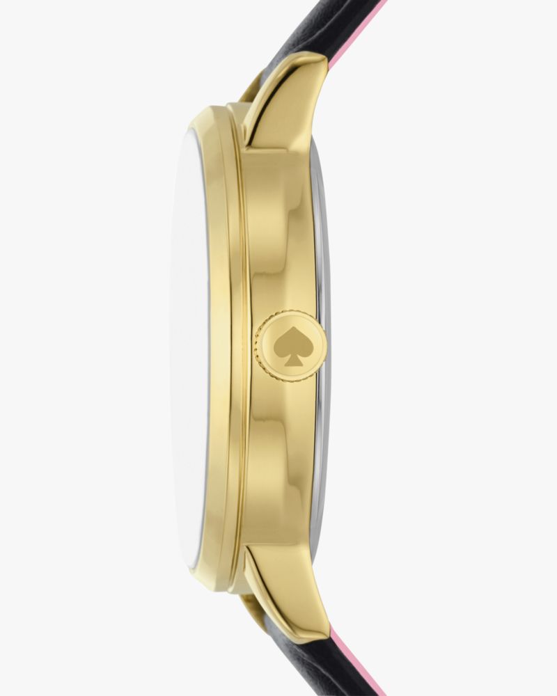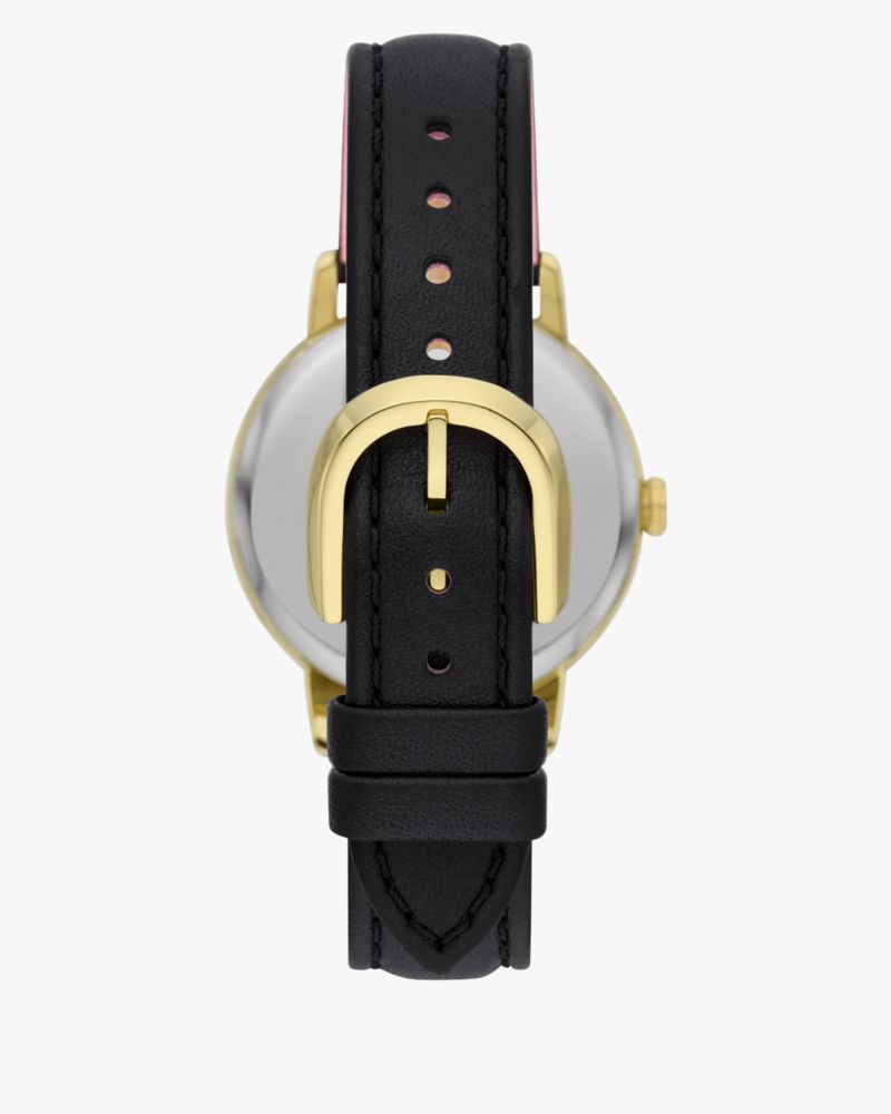 ゴールドトーンメタルケースとブラックレザーストラップ