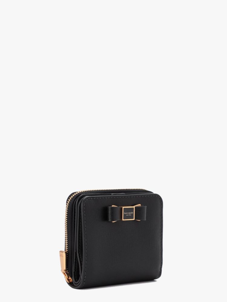 もしあなたがミニバッグを愛用しているなら、この「モーガン」スモールコンパクトウォレットがベストフレンドになるはず。素材には傷がつきにくく、ラグジュアリーな表面感を長く保つサフィアーノレザーを採用。センターに小さなリボンを飾り、愛らしいルックに仕上げています。