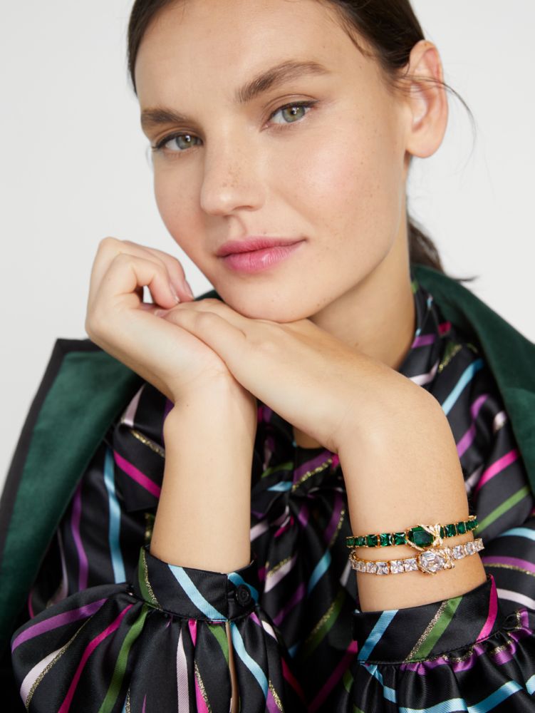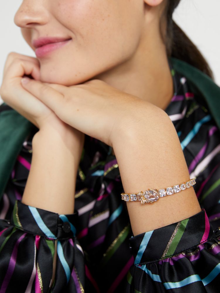 大切なあの人へ贈るなら、ときめきときらめきを忘れないで:聡明な輝きを放つエメラルドカットのクリスタルを、パヴェの飾りが輝くリボンでラッピングしたテニスブレスレット(うっとりするほどファンシー!)。横からも光を受ける端正なボックスシルエットで、どの角度からも手元をラグジュアリーに演出してくれます。