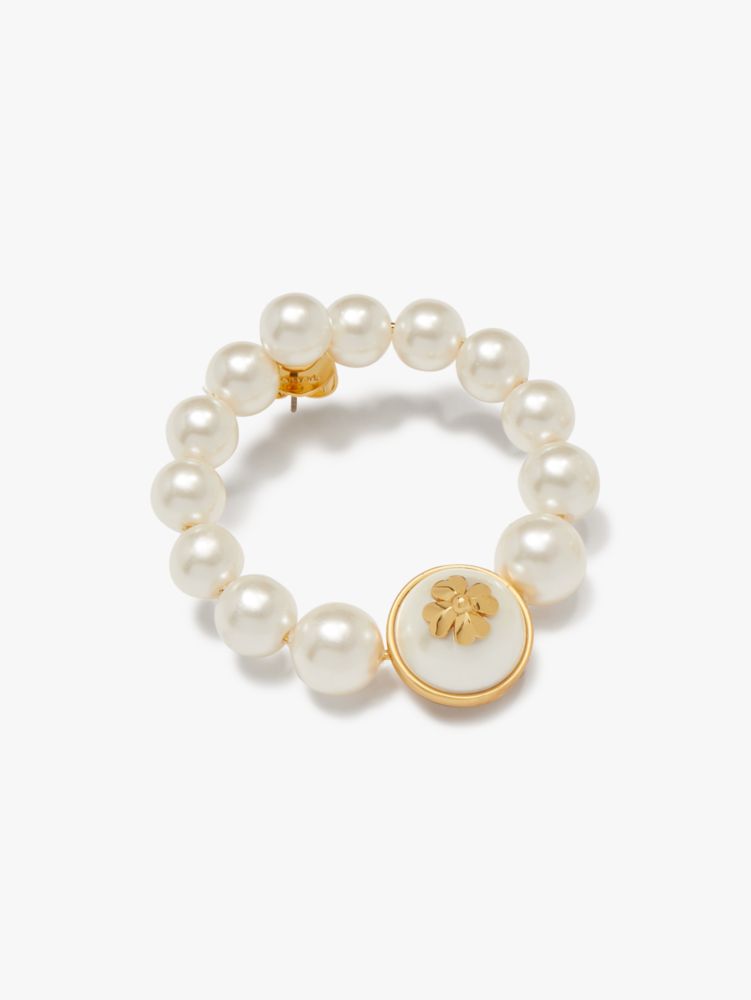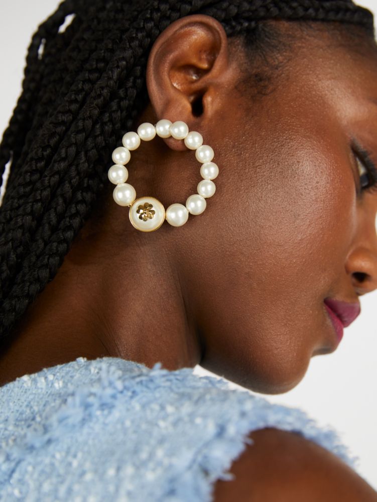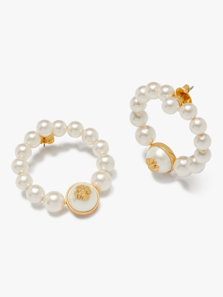 パールプリーズ!フェイクパールをフープ状に連ね、中心の一粒にシグネチャーのスペードフラワーをあしらったピアス。通常のフープピアスとは異なり、耳たぶにフィットするデザインやボリューミーなサイズ感がステートメントの存在感を放ちます。