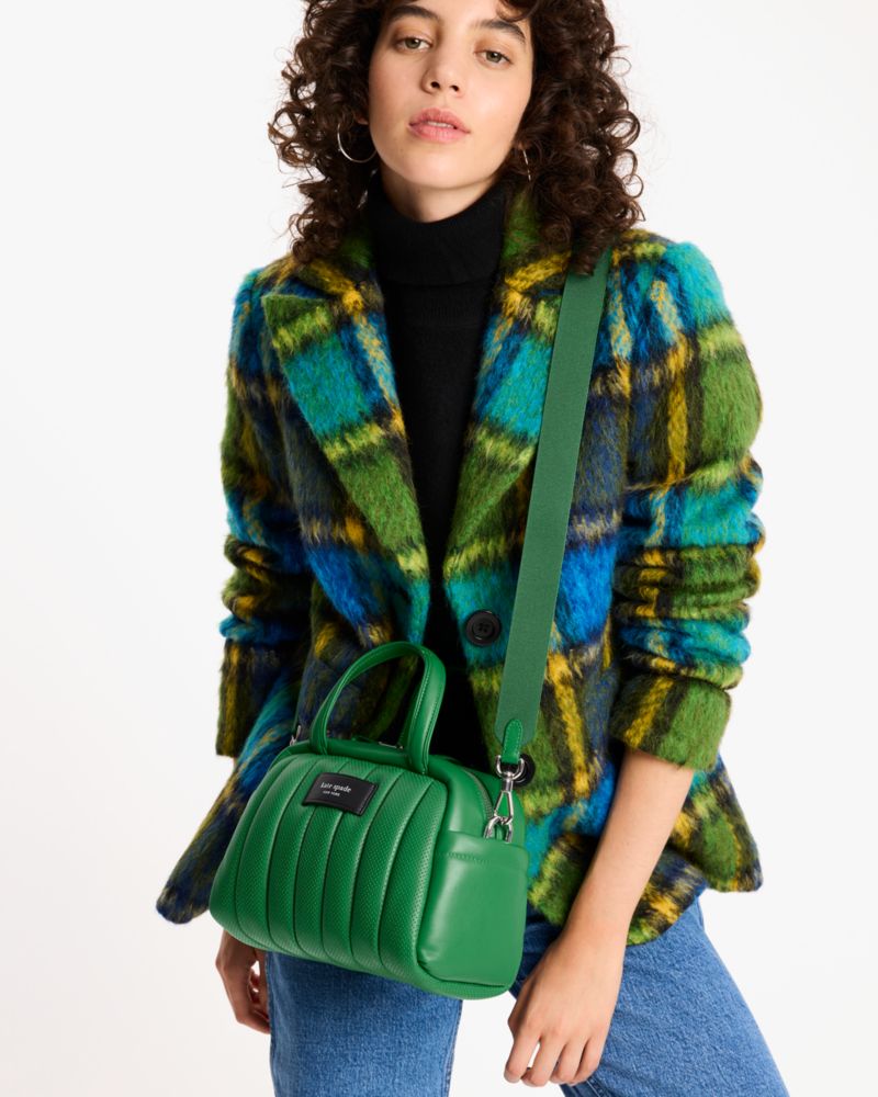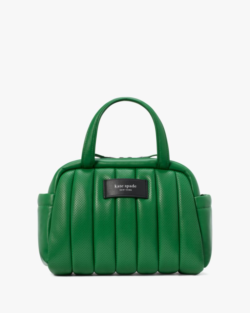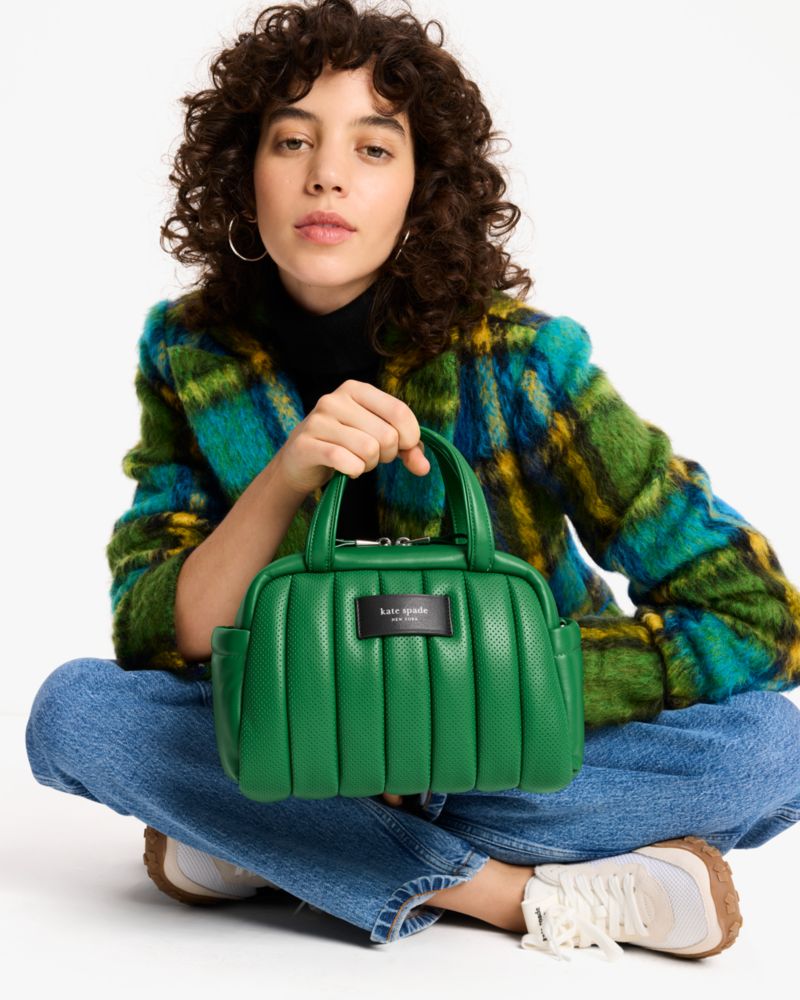 パーフォレーテッドアレザーを用いた極上の触り心地と、ふっくらパフィなルック、冴えるカラー、そして実用性も叶えたレザーサッチェル。クロスボディスタイルが楽しめるストラップを付属し、整理整頓に役立つポケットも装備しています。
