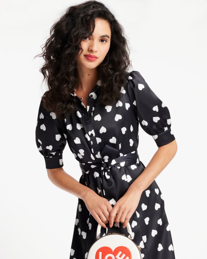 ふっくらと膨らむパフスリーブとスキャッターハートプリント(そしてポケットも!)など、わたしたちが愛してやまないディテールを散りばめ、洗練のルックに仕上げたシャツドレス。シックなブラックをベースにしているので着こなしやすく、愛らしさも同時に演出できる1枚はワードローブにあると大活躍します。