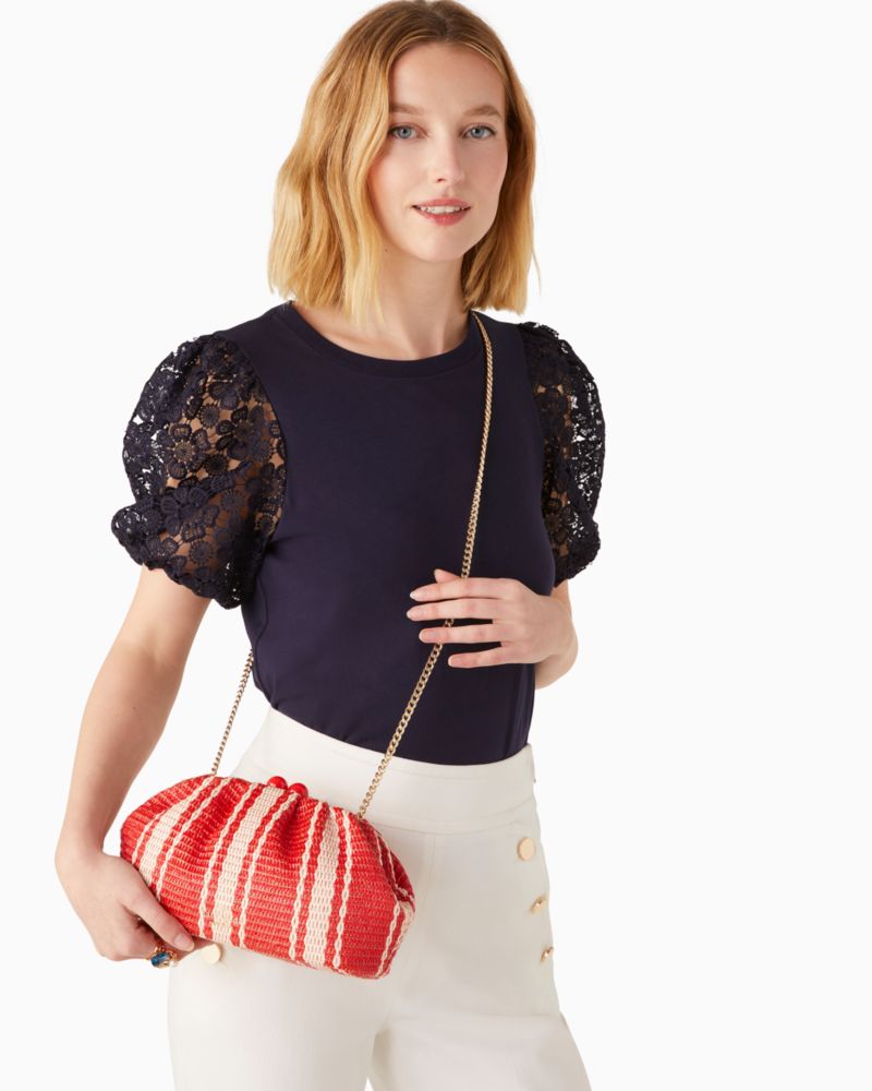 コンサートチケットに思い出の写真、そして秘密のラブノート、もちろん携帯や鍵も収納できるクラッチ。サマーシーズンの手元に映えるストロー素材にストライプを走らせ、爽やかなルックを演出しました。肩がけやクロスボディススタイルも楽しめるよう、華奢なチェーンも装備しています。
