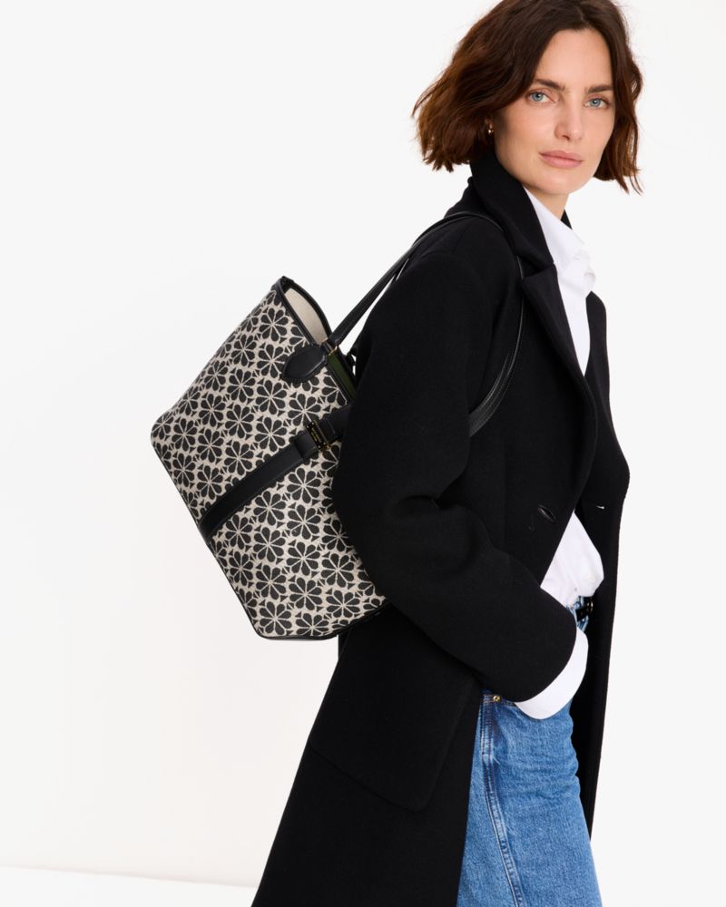 ブランドのヘリテージとしてナイロンと同様に愛され続けるジャカードを、プリントではなく緻密な織りによる独自のファブリックで表現。わたしたちのシグネチャーであるスペード フラワーをさらに特別なものへと進化させるため、北イタリアで100年以上に渡りジャカードの製造と進歩を担ってきた世界的な老舗織物メーカー・リモンタ社に協力を依頼しました。そして、ニューヨークスタイルとイタリアンクラフツマンシップが融合し誕生したのが、このスペード フラワー ジャカードのファブリックを用いたオープン トート。日常の必需品を手軽に持ち運べる、エレガントな相棒です。