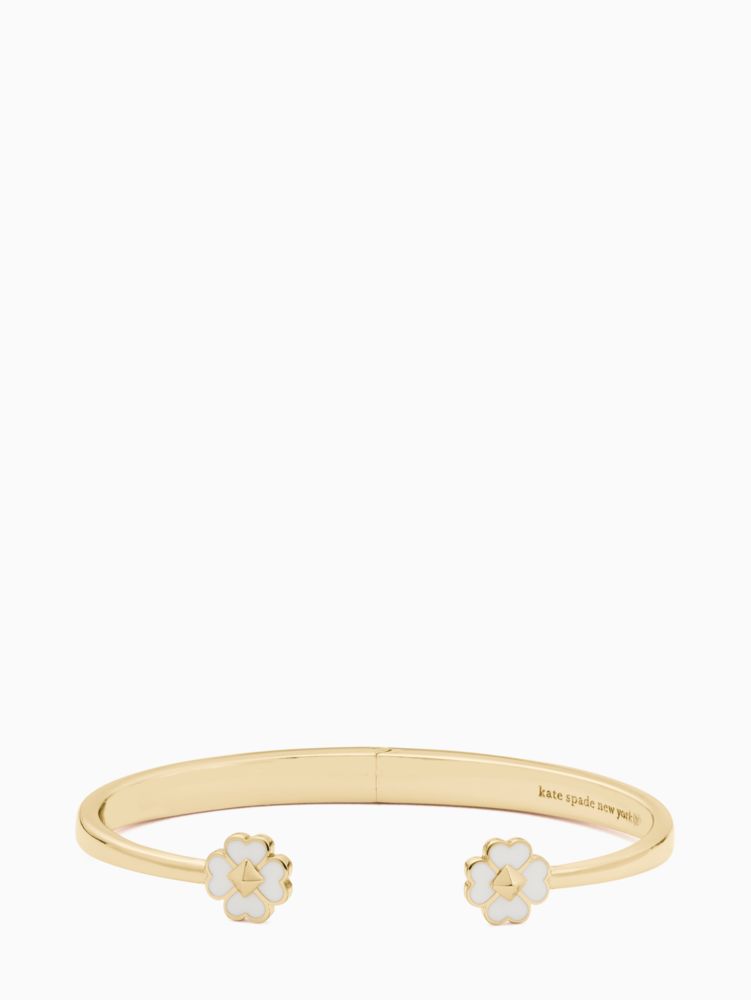 ちょっとしたお出かけから、きちんと装いたい場面までシーンを問わずに愛用できるシンプルでエレガントなカフ。ゴールドメタルのカフスの端に艶めくエナメルのスペードフラワーを施したデザインです。片手で簡単に装着できるヒンジタイプのカフなので、忙しい朝のコーディネートにも大活躍。内側には一粒のキュービックジルコニアとブランドの刻印をあしらっています。