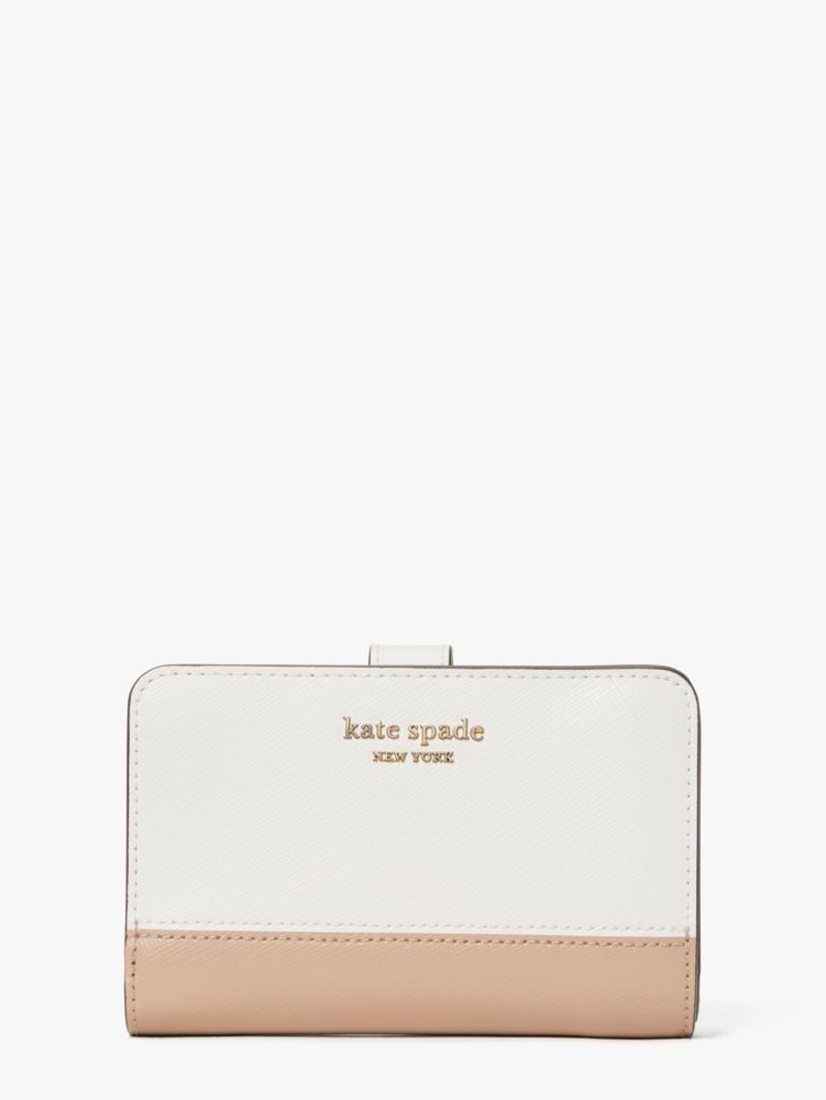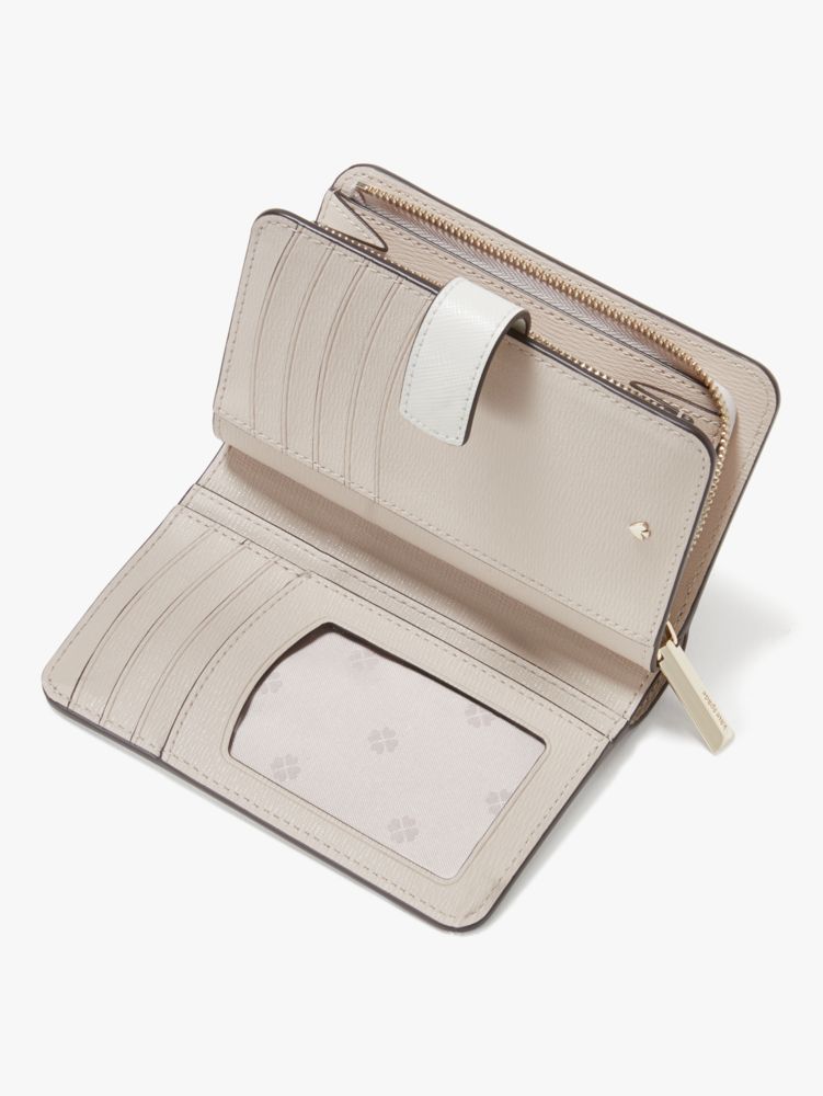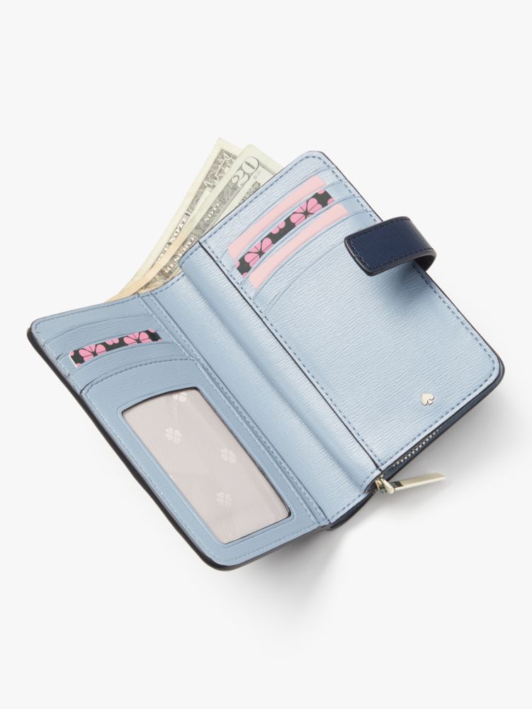 ラグジュアリーな表情と手触りを長く楽しんでいただけるよう、衝撃や傷に強いサフィアノレザーを用いて仕上げた「スペンサー」シリーズのコンパクト ウォレット。サイドまで大きく開くコインポケットに加え、横のスナップを外せばカードをたっぷりと収納できるスロットやICカードに適したクリアウィンドウポケットが現れます。さり気なくあしらったスペードフラワーのジャカードライニングや、小さなスペードのハードウエアがフェミニンなアクセント。