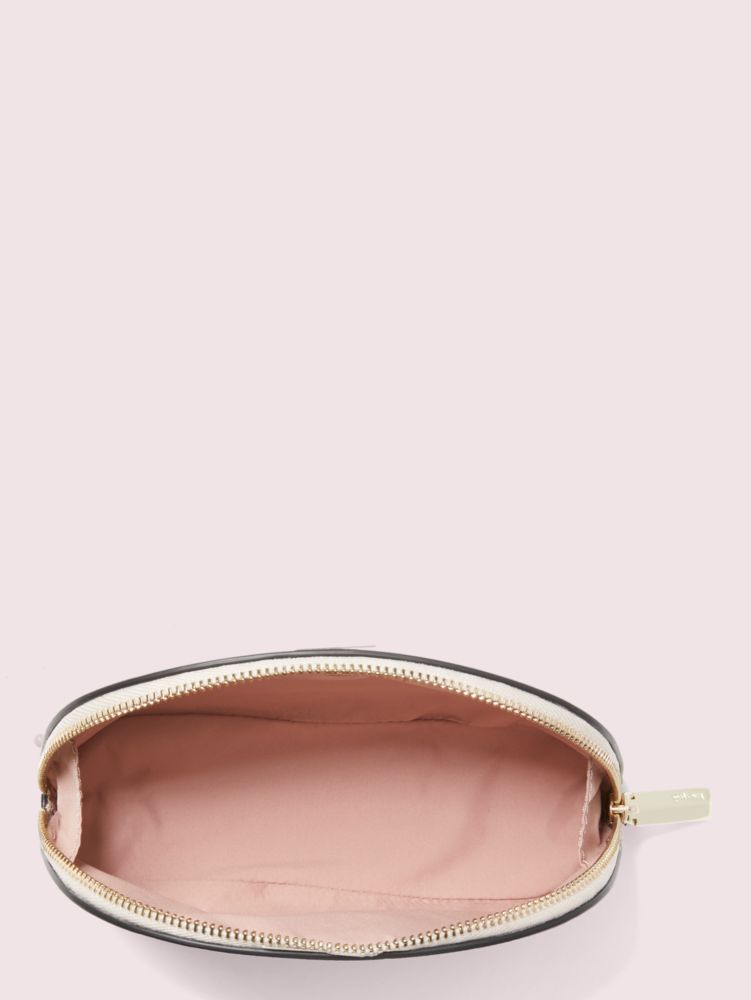 美しく弧を描くソフィスケートされたフォルムが魅力のコスメティックポーチ。ずっと愛用できる飽きのこないルックを化粧品や小物の収納にぴったりのサイズで仕上げたました。大きく開いて中身が取り出しやすいファスナー式クロージャーで整理整頓も簡単。たっぷり入るマチは、安定性もあり洗面台でのお化粧直しに活躍します。