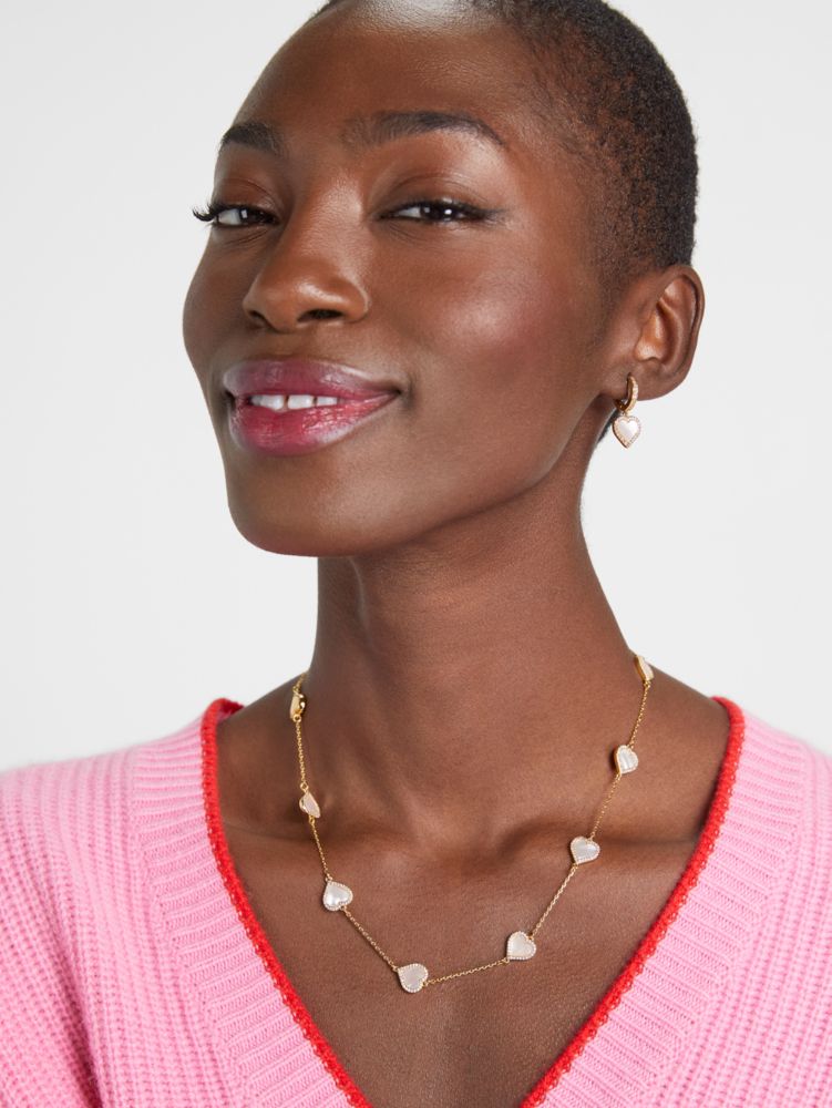 ハートが欲するものに素直になって:光を集めて優雅に艶めくハート型のマザーオブパールを小さなクリスタルで囲い、ネックラインをぐるりと囲むように並べました。単品使いで愛らしく、お手持ちのネックレスとレイヤードしてラグジュアリーにとアレンジを楽しんで。