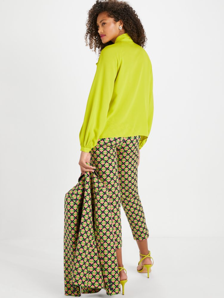 未来は明るく―まるで、このタイネックシャツのように。春風を柔らかくはらみ、優雅なシルエットを演出するダブルジョーゼットで仕立てたシャツ。ジャケットの下からタイネックをふんわり覗かせたりと、ビジネスシーンでも活躍するアイテムです。