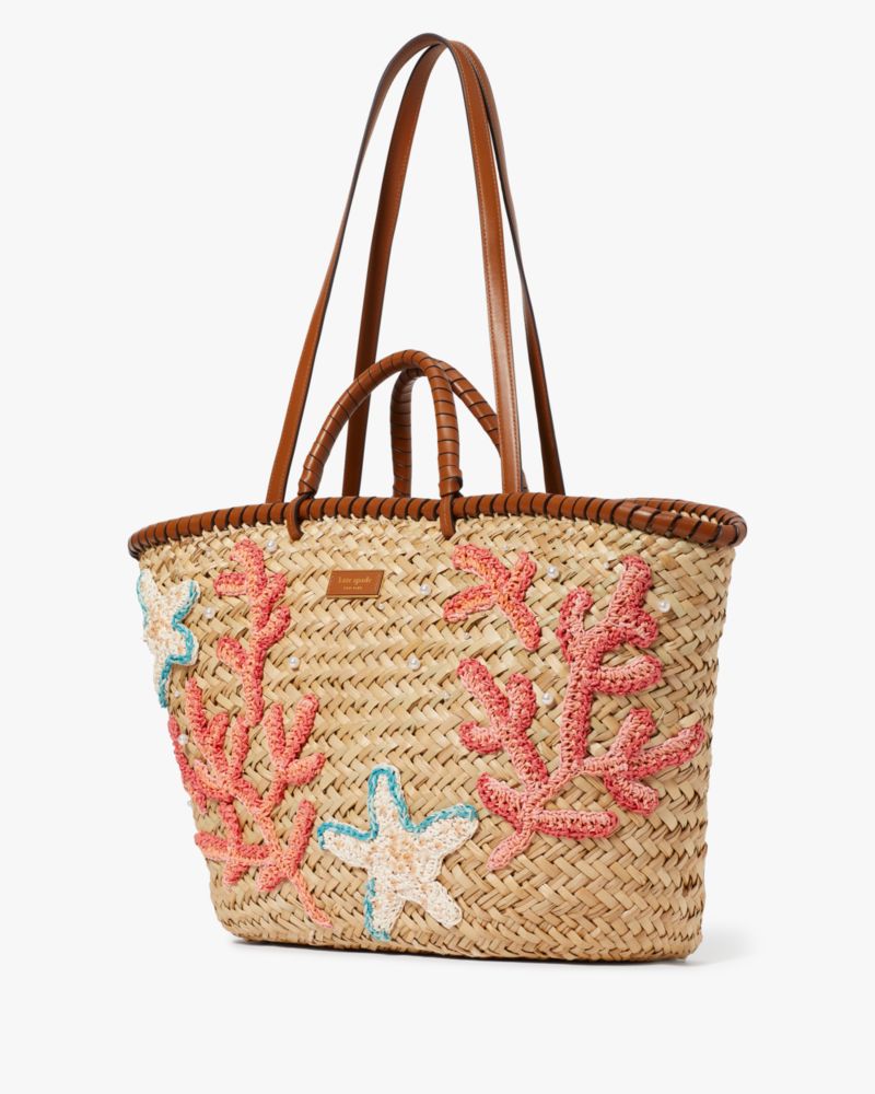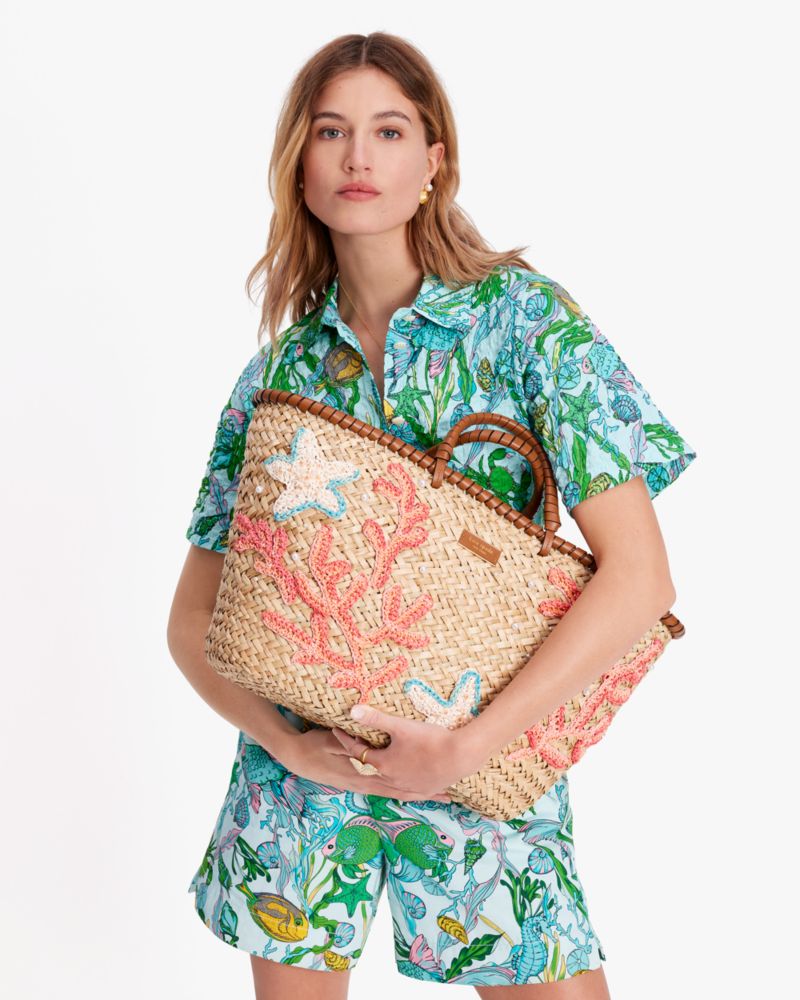 ビーチへ向かう準備はOK? カラフルな海の生物を飾ったストロートートバッグを片手に添えれば、パーフェクトなサマールックの完成。ビーチタオルやドリンクなど、夏の必需品をすべて収納することができる広々としたスペースを確保しています。